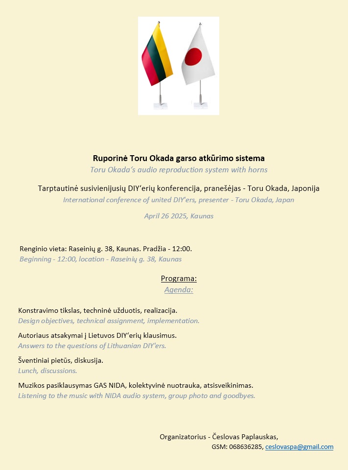 Iki renginio 3 savaitės, bet tikiuosi viskas vyks sklandžiai ir balandžio 26-os dienos šeštadienį mes sulipsime į DIY’erių konferenciją – “Ruporinė Toru Okada garso atkūrimo sistema”.